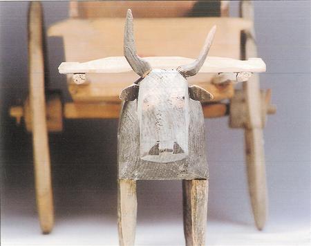 木牛俑高度約20厘米左右,通常先雕出輪廓,然后通體飾黑彩,白彩勾眼和絡頭等。從造型來看,木牛目視前方,屈背,四足蹬地,身軀健壯有力。拉著牛車或拉木犁的牛俑一般繪有絡頭,表現了田間勞作的情景。到西漢時期,隨著“軍事屯田”與“徙民實邊”政策的推行,牛耕技術在甘肅河西地區逐漸普及開來。