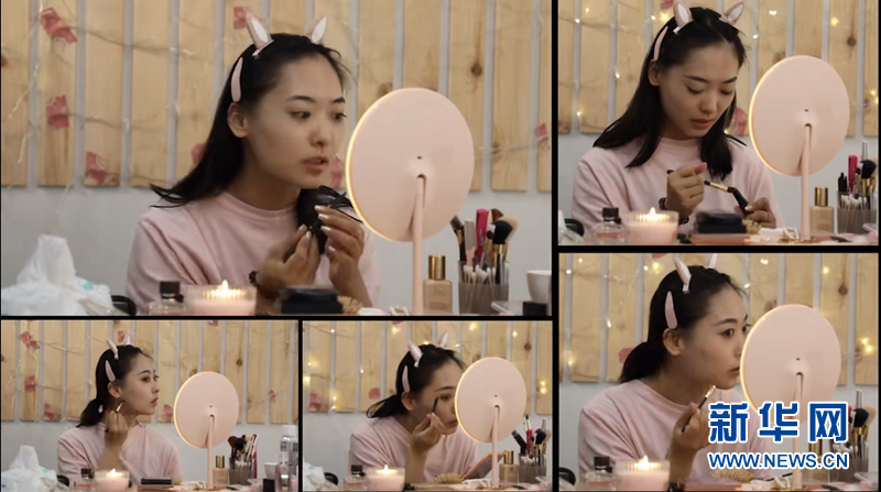 化妝鏡、美妝工具、閃爍的背景燈,在臨時(shí)搭建的“直播間”里,班銳開工了。