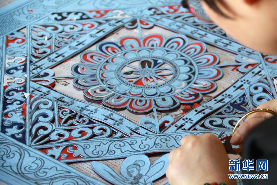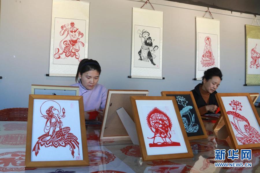 在甘肅敦煌小鎮鳴沙書院,學員在“敦煌剪紙”酒泉市級非物質文化遺產代表性傳承人莊生娟的工作室內剪紙(2020年12月31日攝)。新華社發(張曉亮 攝)