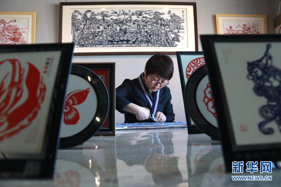 在甘肅敦煌小鎮鳴沙書院,“敦煌剪紙”酒泉市級非物質文化遺產代表性傳承人莊生娟在自己的工作室內創作(2020年12月31日攝)。新華社發(張曉亮 攝)