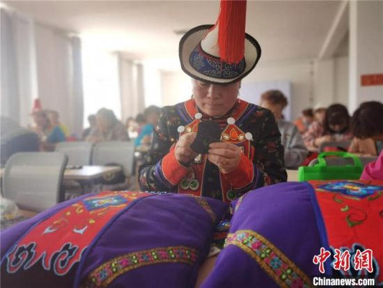 圖為裕固族服飾非遺傳承人為學員傳授傳統服飾刺繡。 史靜靜 攝