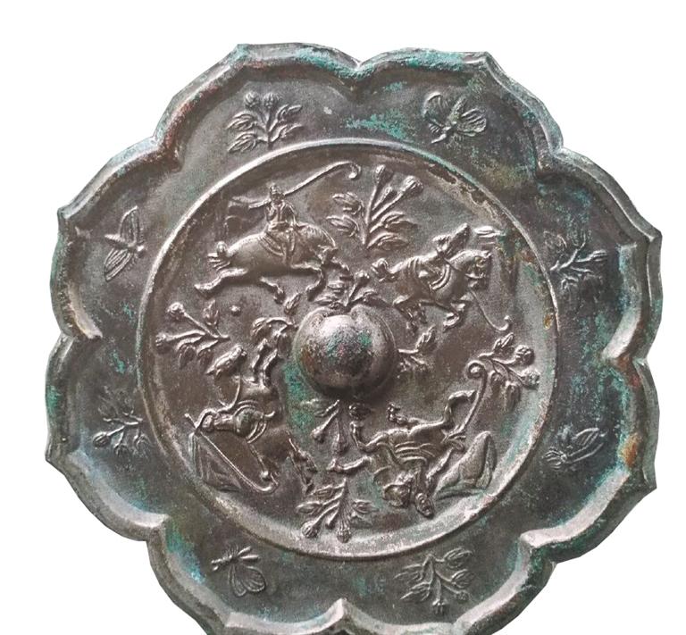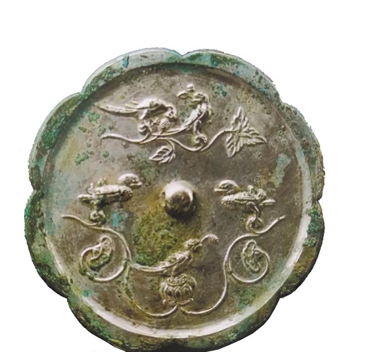隋唐時期是中國封建政治經濟文化高度發展繁榮的時期,唐代社會經濟全面發展,手工業各部門也都興旺發達,青銅鑄造業中的銅鏡業尤為突出,無論造型、題材、紋飾、鑄造工藝,都突破了前代的模式,達到了中國古代銅鏡藝術的巔峰。唐鏡鏡型厚實,方形鏡、菱花形鏡、葵花形鏡流行;紋飾題材多見瑞獸、飛鳥以及葡萄、花草等;瑞獸葡萄鏡最具特色,是中西文化融合的杰作。