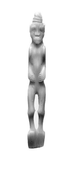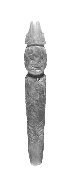 兩件玉人,一為白玉,玉人裸體直立,發辮虎首蛇身盤成堆髻。長臉,闊鼻,深眼窩,大耳,厚唇前突,兩手捧腹,神情肅穆,玉人背部可見雙臂肘,以及脊柱凹槽。兩腿間“8”形鏤空,雙足并攏作鏟形,有斜刃。玉人無明顯性別特征,但從身軀面相可判定是男性。