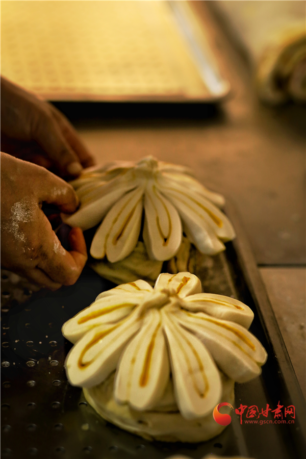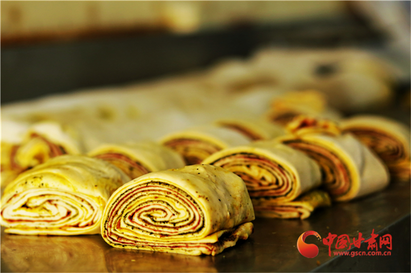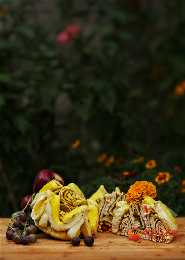 香豆、油酥、姜黃、紅曲、胡麻……最樸實的食材,最傳統的工藝,讓月餅在蒸汽中充分鼓脹,最終飽滿盛開。卷沿彎曲,狀似玫瑰。切開,內里豐富,色彩斑斕,如同張掖丹霞,熠彩生輝,包羅萬象。(本網記者 宋芳科 通訊員 張文)