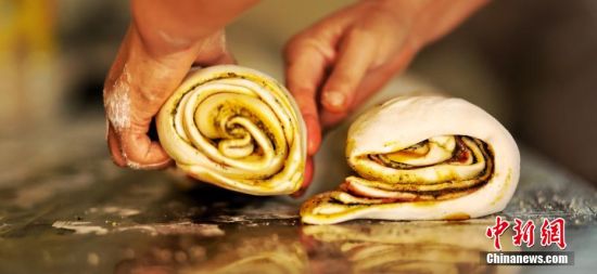 中秋節臨近,連日來蘭州市榆中縣家家戶戶開始制作傳統月餅,依照古老的技藝在大花饅頭中加入香豆、油酥、姜黃、紅曲等各種佐料,層層卷曲,色彩斑斕,狀似玫瑰。張文 攝