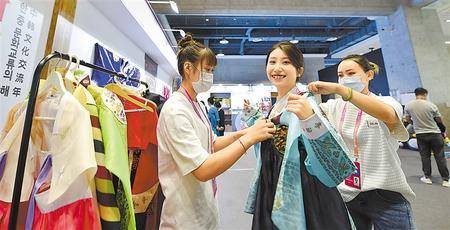 參觀者感受韓國(guó)傳統(tǒng)服飾。
