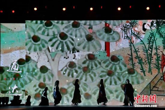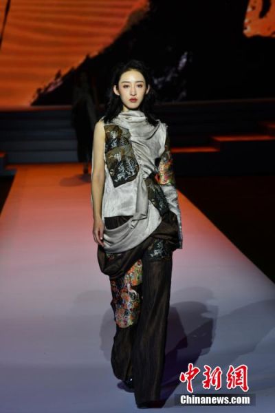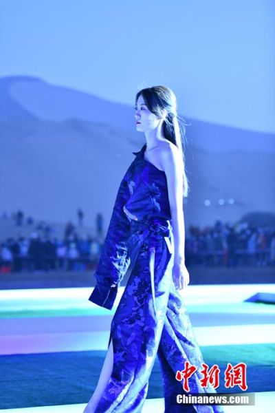 10月16日晚,敦煌國際時尚周在鳴沙山月牙泉景區開幕,張肇達·張凱惠攜手的作品在這里進行了展演秀。圖為敦煌服裝秀展示。 殷春永 攝