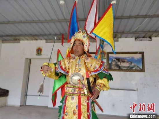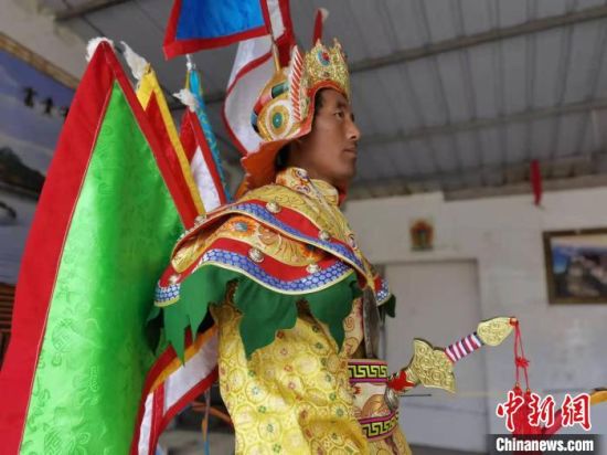 現年50歲的完代才讓換上藏戲服飾,拿著道具在舞臺上踱步高歌“南木特”藏戲《阿拉達姆》。 張婧 攝
