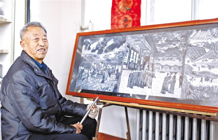 接下來就是耗費工時與體力的制作過程,“每天創作雕刻都在三四個小時,每分鐘在刻板的敲擊次數達到近200次,每小時敲擊次數達到8000-12000次,9大板塊在創作過程中就要敲擊近16億次點,每個板塊耗時10-11個月,9大板塊共耗時3000多天。”陶世清細數著創作的艱辛。