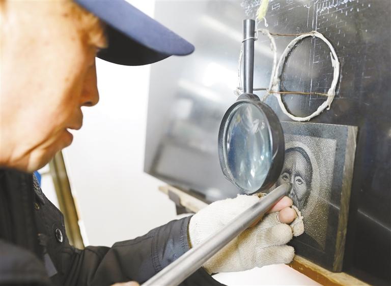 在大理石板上雕刻,是傳統手工技藝影雕的一種。這種雕刻方式采用墨玉、山西黑等純色石材,經過水磨拋光后,在磨光面上要把雕琢的圖像輪廓描繪出來,根據黑白明暗成像原理,用特制的像針一樣細小的合金鋼頭工具,通過運用腕力調節針點疏密粗細、深淺和虛實線變化而表現圖像。