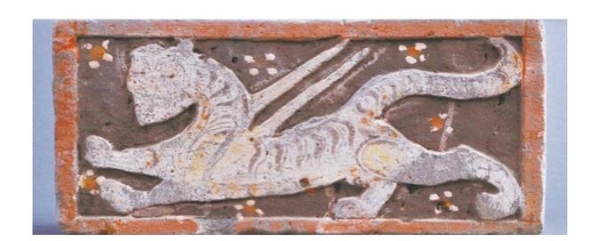 通過彩繪磚可見,這只白虎昂首,張口作怒嘯狀,雙翼挺出,身飾虎斑紋,曲尾上揚,四肢騰躍。四周點綴四瓣白葉花,花心點橘紅色。