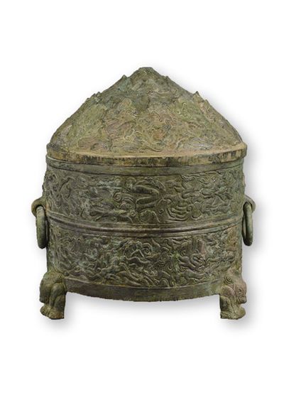該銅樽(圖②)通高27.5厘米、口徑22.3厘米、 底徑23.5厘米。博山形蓋,子母口,直筒腹,腹中部作兩對稱鋪獸銜環,平底,三熊足。通體浮雕,博山形蓋上山巒重疊,仙氣繚繞,雕刻有龍、虎、熊、鳳鳥、羽人等。羽人身體比例和諧,形態多樣,或雙手前伸,前腳彎曲后腳蹬地,矯健有力;或席地而坐,頭微側,雙手自然上伸,神情專注;或舞手屈膝,身形流暢,瀟灑自然。蓋口圈帶刻折線三角形鋸齒紋,器口沿和底沿作圈帶,分別刻弦紋、菱格紋和折線三角形鋸齒紋。腹部用凸弦紋分為上下兩層,上層浮雕翻騰的云海和飛禽走獸,下層雕刻形態各異的龍、虎、熊等瑞獸。三熊作足,縮頸聳肩撐起樽體。