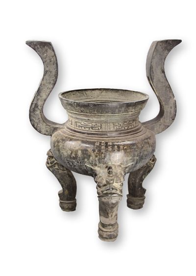 該銅爐(圖⑤)通高101厘米、口徑49.3厘米。爐器形碩大,造型精美,整體呈鼎形,侈口斜沿,內折窄唇,束頸,溜肩,S形對稱高耳,鼓腹,圜底,獸面吐舌形三高足,足跟缽形。頸上部飾凸弦紋,中部浮雕夔龍六條,雷紋襯地;肩部飾二道凸弦紋;腹部鏨刻“時大明崇禎三年歲次庚午季春,韓藩太妃國母董氏、韓王亶嵴妃慕容氏造”及紀年、造者、監造、工匠等59字銘文。據銘文,此爐為明代第十一代韓王朱亶嵴所鑄,是研究明代韓王歷史的珍貴文物。