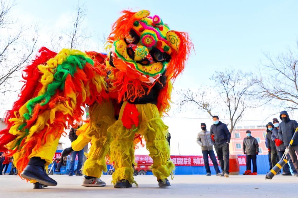 1月26日,甘肅省張掖市甘州區堿灘鎮草湖村文化廣場上,村文化隊為鄉親們表演了獅頭擺,追繡球,飆起來,威掃天下知的獅舞,迎接即將到來的新春佳節。