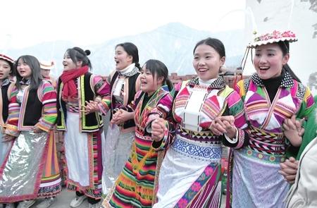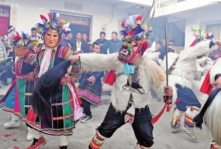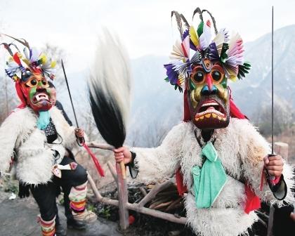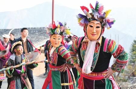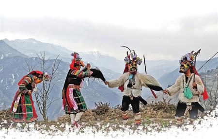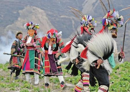 文縣鐵樓鄉麥貢山村,當地居住的東亞最古老部族白馬藏族用自己獨特的民俗——跳“池哥晝”,歡度元宵佳節。
