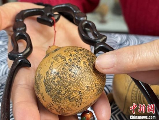 2月15日,蘭州市非遺傳承人陳兵在工作室展示自己雕刻的微雕作品,她擅長在雞蛋大小的葫蘆上雕刻敦煌壁畫、敦煌飛天,以及佛教經文,一把刻刀上下翻飛之后,雕刻形象神態逼真。