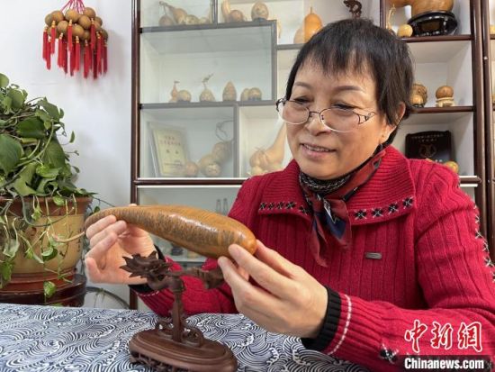 圖為長約二十公分的長條葫蘆雕刻佛教經文作品。 張婧 攝