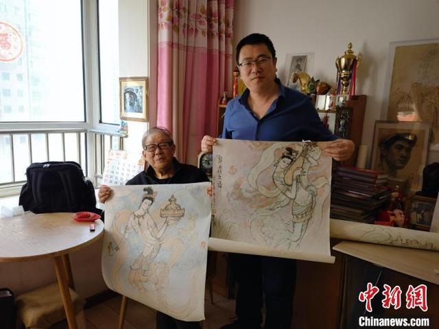 3月上旬,《絲路花雨·誕生》作者陳曉斌(右)拜訪今年86歲的舞美設計師李明強(右)老先生。 王先孟 攝