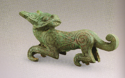 禮縣大堡子山祭祀樂器坑出土,共三只,造型相同,大小相似,為全國虎伴樂器出土的首例。其形象回首卷尾、聳耳曲爪、憨態可掬,極具觀賞性,是春秋時期虎造型的杰作,體現了秦國早期高超的造型能力和精湛的鑄造技術。虎的形象在春秋秦人的器物中多見,不但有自成個體的金虎、青銅回首虎,同時虎作為附飾也出現在一些大的青銅器上。