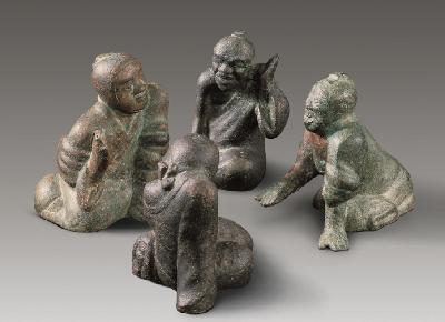 四俑相向跪坐,身著漢代最常見的高領衣服。二人頭頂盤挽發髻,二人以寬巾裹首。坐姿不同,形態各異,最為精彩有趣的是四俑的面部表情,或喜笑顏開,或怒不可遏,或凝神沉思,或憂傷悲愁。
