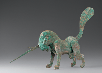 獸頭向前沖,角向前刺,扁尾上翹,四足跨張作角斗狀,全身鑄有獸毛的紋飾。角和尾可拆卸。獨角獸是傳說中的一種神獸,隨葬在墓中,起鎮墓辟邪的作用。