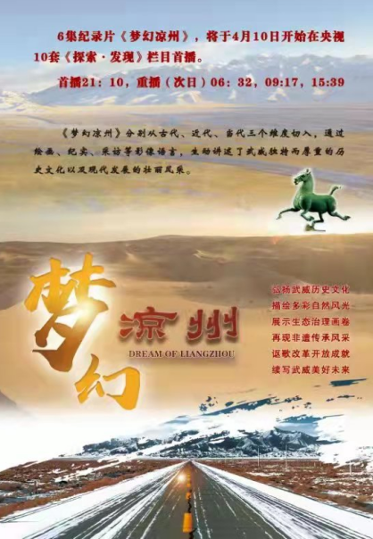 中國甘肅網(wǎng)4月7日訊(本網(wǎng)記者 張振國)近日,記者自CCTV-10科教頻道獲悉,六集紀(jì)錄片《夢幻涼州》將于4月10日在中央電視臺科教頻道《探索·發(fā)現(xiàn)》欄目首播。首播21:10,重播(次日)06:32,09:17,15:39。