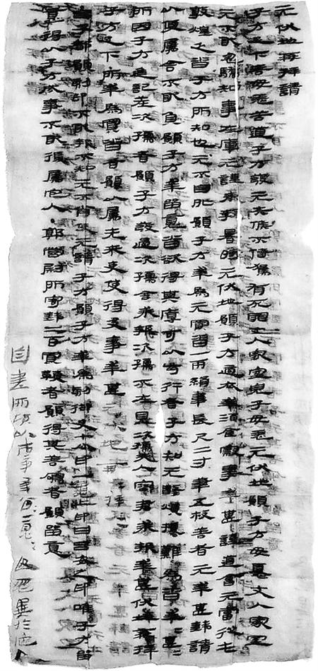 子方足下,善毋恙!苦道子方發,元失候不侍駕,有死罪。丈人、家室、兒子毋恙,元伏地愿子方毋憂。丈人、家室元不敢忽驕,知事在庫,元謹奉教。暑時元伏地愿子方適衣、幸酒食、察事,幸甚!謹道:會元當從屯敦煌,乏沓,子方所知也。元不自外,愿子方幸為元買沓一兩,絹韋,長尺二寸;筆五枚,善者,元幸甚。錢請以便屬舍,不敢負。愿子方幸留意,沓欲得其厚、可以步行者。子方知元數煩擾,難為沓。幸甚幸甚!所因子方進記差次孺者,愿子方發過次孺舍,求報。次孺不在,見次孺夫人容君求報,幸甚,伏地再拜子方足下!所幸為買沓者,愿以屬先來吏,使得及事,幸甚。元伏地再拜再拜!