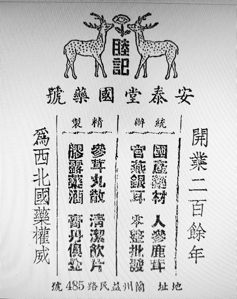安泰堂作為百年老店,其廣告詞自然頗具氣場。首先明確定位:“開業二百余年、為西北國藥權威”,其次是統辦“國產藥材、人參鹿茸,官燕銀耳、零整批發”,最后是本店特色,精制“參茸丸散、清潔飲片,膠露藥酒、膏丹俱全”。