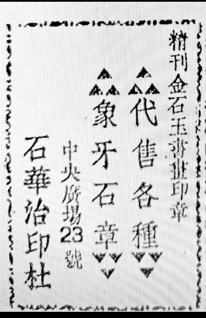 最后要提到的一則廣告也與文化有關。蘭州和平日報社1947年出版的《新蘭州》一書中,曾刊登石華治印社廣告,其廣告詞曰:“精刊金石玉書畫印章、代售各種象牙石章”,社址在中央廣場23號,其創辦者即為隴右印壇名宿駱石華先生。駱石華先生1920年生人,彼時未及而立,尚未入白石先生門下;筆者家外祖解放前供職中央廣場郵局,當年曾與石華先生相交。今偶于舊籍中覓得石華治印社當年廣告,恭錄于此,既為本文收尾,亦為家外祖與石華先生半個世紀友誼之緬懷。