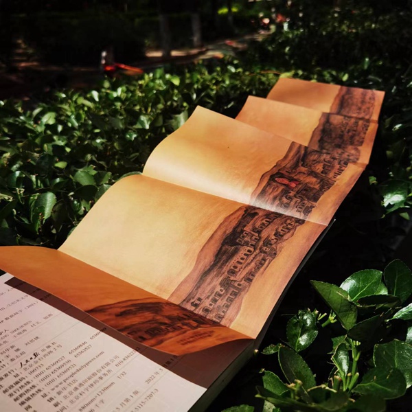 特別值得一提的是,曾作為敦煌“文化守望者”的90后插畫師陳夢楚,依據歷史資料為該書手繪原長達3.4米的全景圖,呈現莫高窟南區歷史圖景。這也是青年一代致敬莫高窟、致敬敦煌前輩的藝術表達。