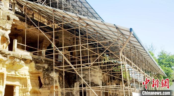 在北石窟寺,多體量多結構腳手架支撐起保護棚,窟龕輪廓若隱若現。崔惠萍介紹說,該防水工程,屬于實驗性,于2021年3月建成,能最大程度覆蓋遮擋崖體,保護崖面窟龕,防止雨水對石窟的沖蝕破壞。