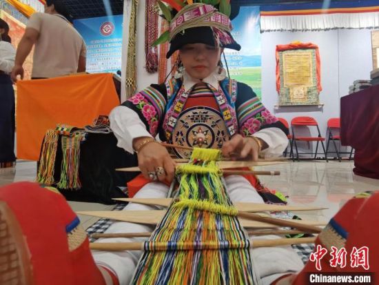 中新網甘肅張掖6月8日電 (閆姣)腳蹬紡織板,手持木梭子,甘肅甘南藏族自治州舟曲縣藏族姑娘全庸卓瑪坐在地上,展示省級非遺織錦帶,藏族婦女用其束腰、扎靴。她說,這項技藝后繼乏人,希望通過這種“走出去”的活動,讓更多人了解這一獨特文化。