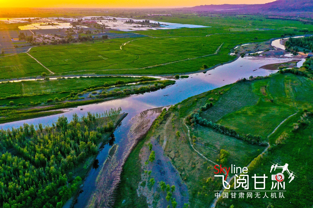 6月15日,位于張掖市甘州區靖安鄉、烏江鎮境內的黑河兩岸,在夕陽的映照下綠意盎然,盡顯勃勃生機,構成了一幅綠色美景畫卷。