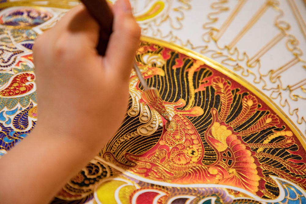 此后30多年,李海明不斷傳承創新,將排絲、壘絲、螺旋絲、柱狀絲等鑲嵌技法引入掐絲琺瑯藝術,利用100多種基礎琺瑯釉料調制出4000多種過渡色及配色,攻克了琺瑯壁畫釉料脫落的難題,提升了琺瑯壁畫作品的藝術價值和收藏價值。截至目前,他共創作2000多幅掐絲琺瑯壁畫作品,先后30多次獲國家級和省級工藝美術類大賽金獎,部分作品被國家博物館收藏。