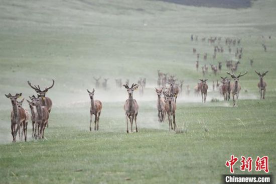 夏日時節,位于祁連山北麓的甘肅省張掖市肅南裕固族自治縣,數百頭馬鹿在草原上崩騰、休憩覓食。 楊艷敏 攝