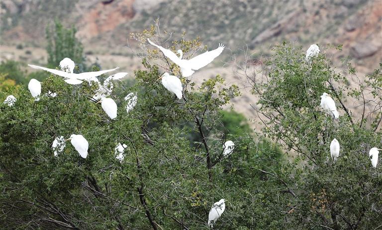 中國甘肅網10月14日訊 據蘭州日報報道 金秋十月,蘭州新區秦王川國家濕地公園秋意漸濃。近日,隨著近百只白鷺的光臨,秦王川國家濕地公園再次迎來了候鳥遷徙的高峰期,成群的白鷺憩息在樹枝,繪就了一幅亮麗的秋景圖。