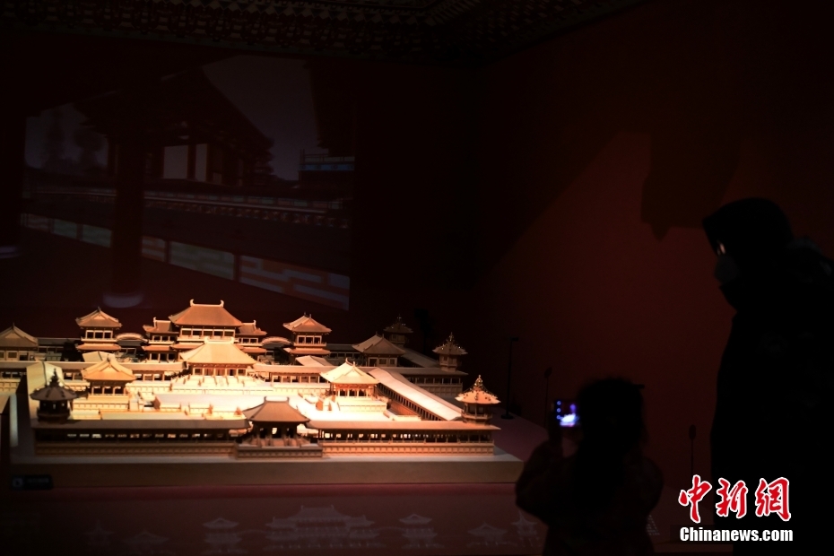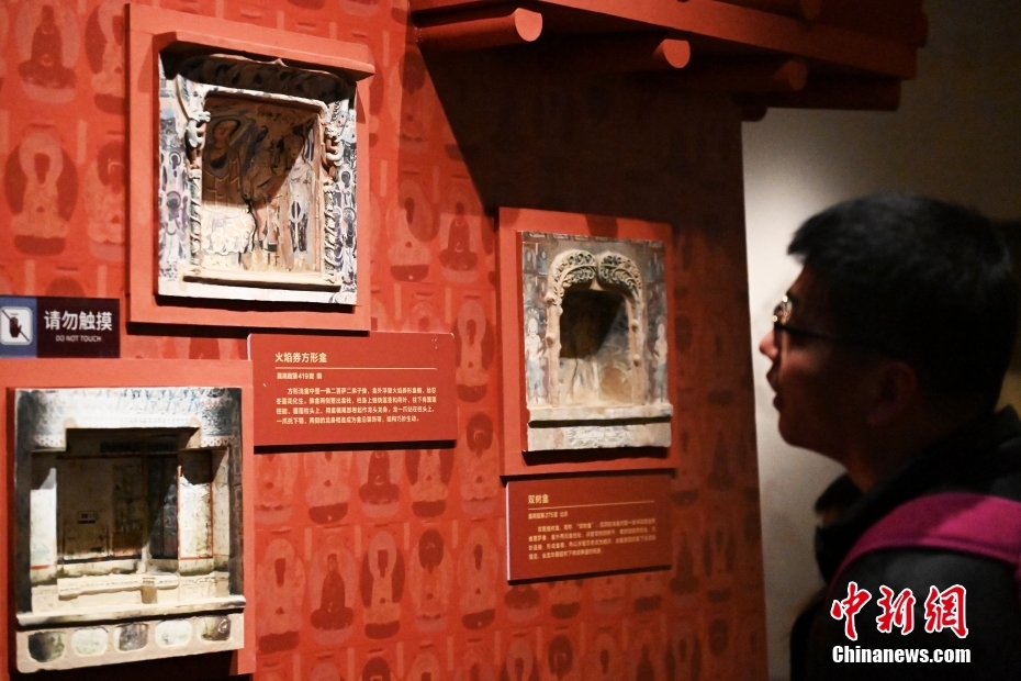游客正在參觀“千年營造——敦煌壁畫中的建筑之美”特展上出自莫高窟第419窟的火焰券方形龕模型。(中新社記者 李亞龍 攝)