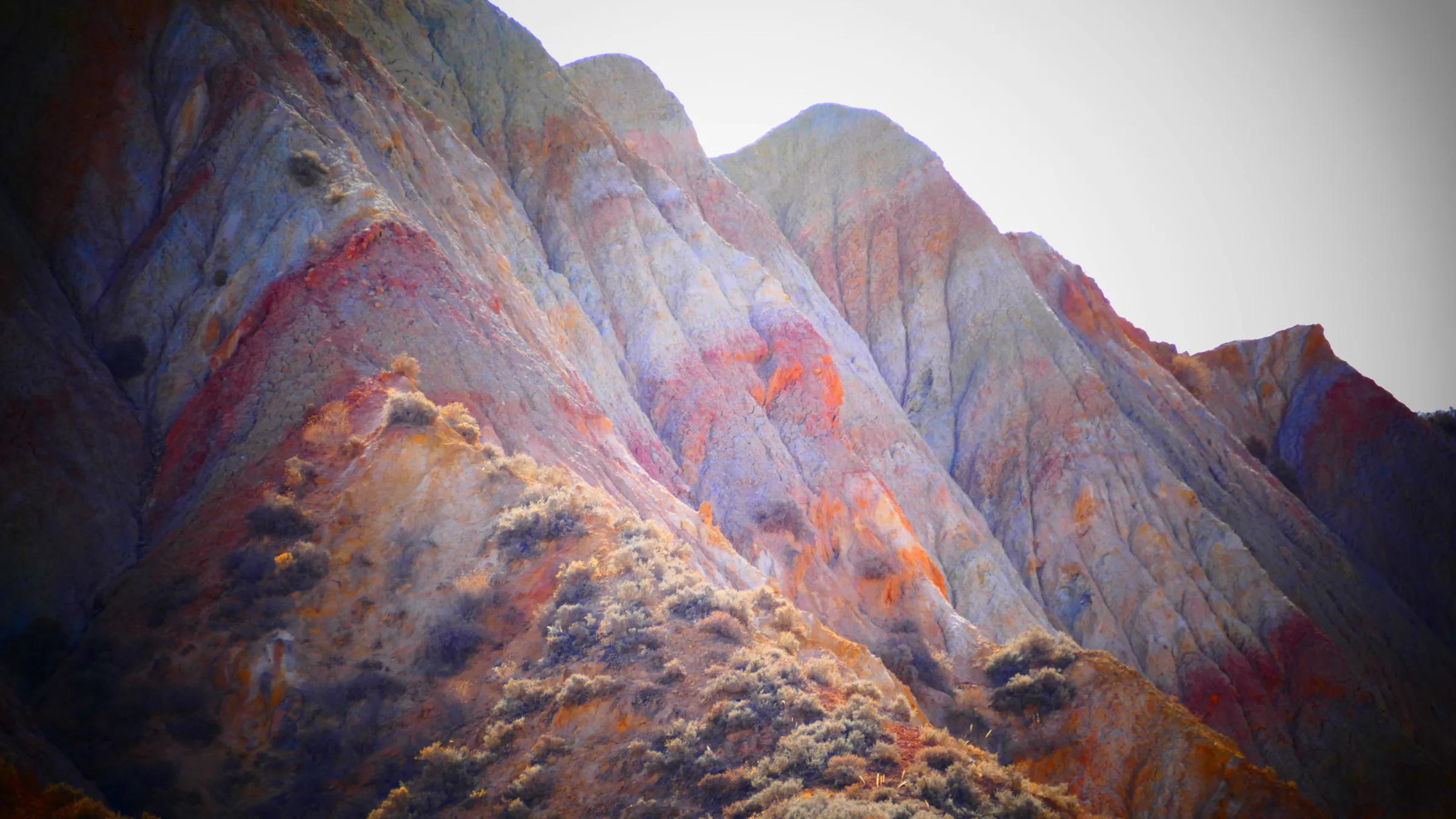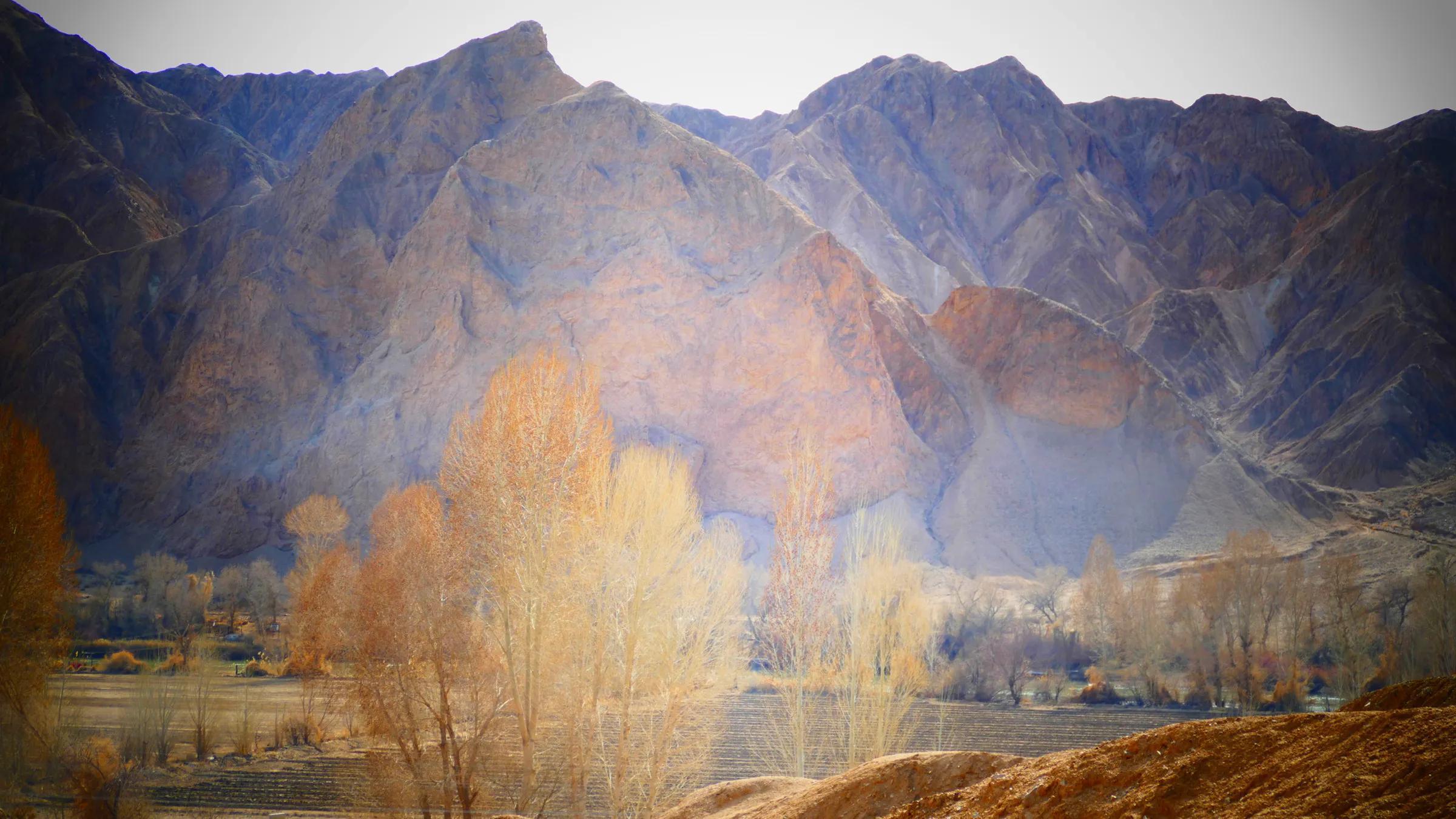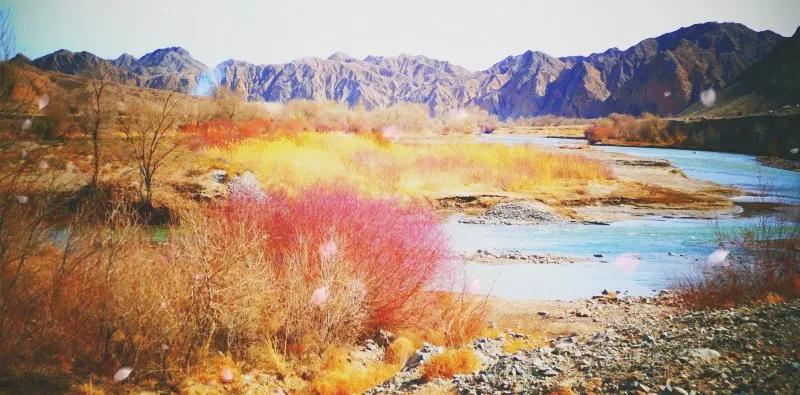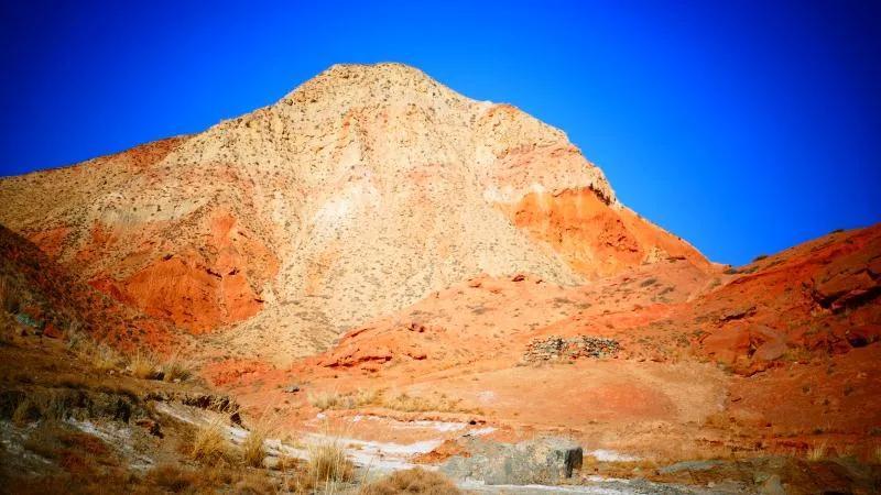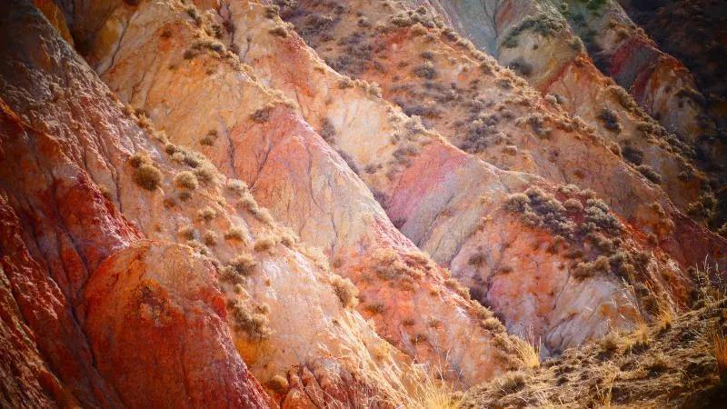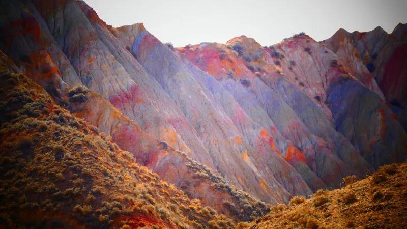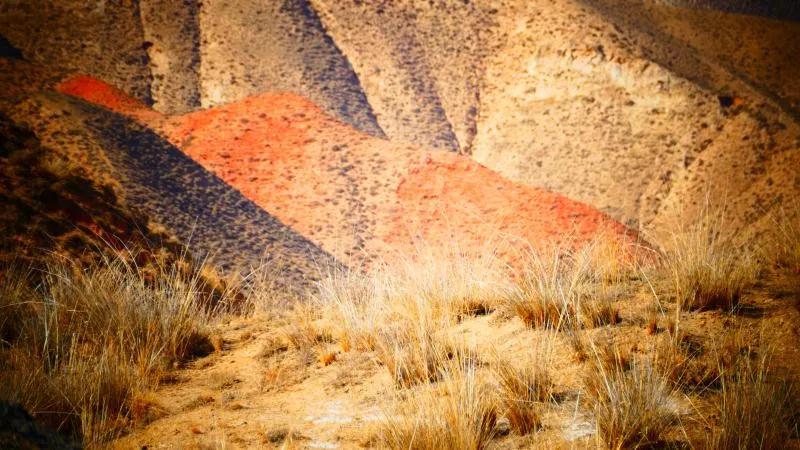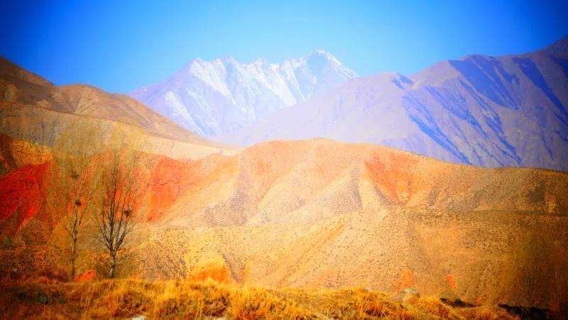 從馬營河大峽谷南端再向南一眼望去就是祁連雪山,沿著河道通過高臺縣新壩鎮的紅沙河村,向東南走進祁連山脈可見一片五顏六色的奇觀,又一個丹霞地貌在祁連山展現,可稱高臺“小泉丹霞〞。據說這個“丹霞”還沒有媒體“曝過光〞。
