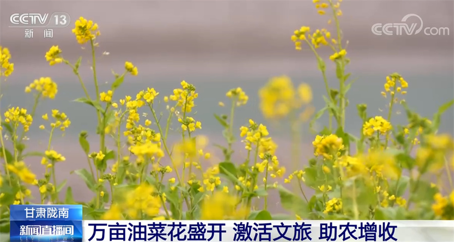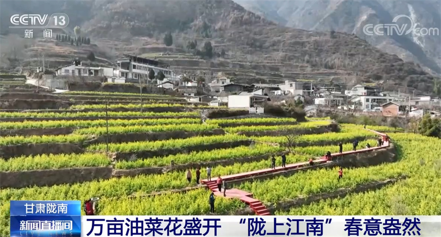 總臺記者 項思:這里是甘肅省隴南市文縣,位于甘肅的最南端,也是甘肅最早迎來春天的地方。一江碧水、兩岸青山,大面積盛開的油菜花迎著和煦的春風泛起金色的波浪,一股濃烈的春天氣息撲面而來。從春節前10天左右,這里的萬畝油菜花就陸續開放了。如今步入春天,油菜花已進入盛花期。文縣接壤四川,嘉陵江的上游白龍江穿越境內,氣候溫暖潮濕,具有夏無酷暑、冬無嚴寒的氣候特點,被稱為“隴上江南”。