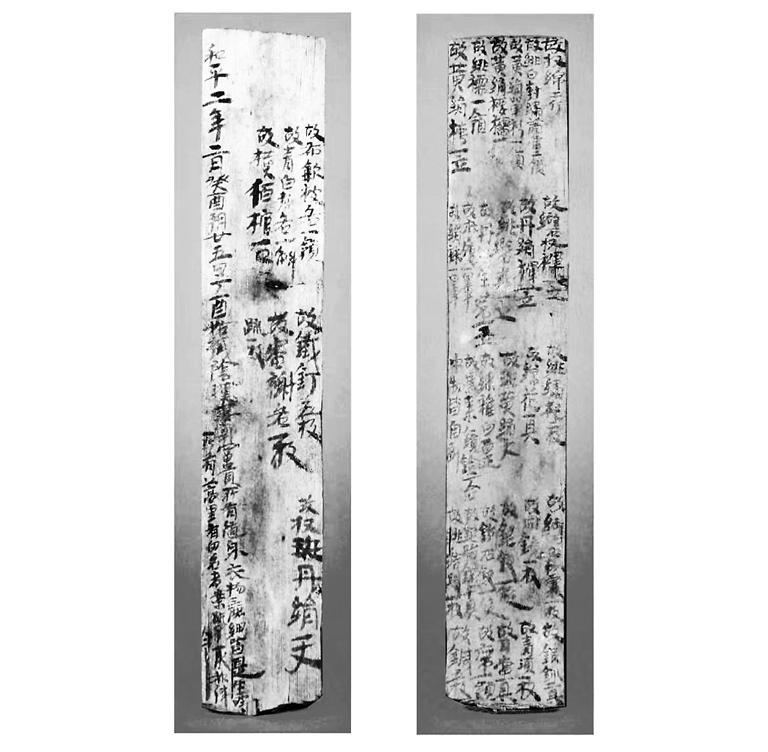衣物疏木質,保存基本完好,長37.2厘米,寬6.5-6.9厘米,厚0.6-1.1厘米。衣物疏在墓中的主要作用是記載墓主隨葬衣飾和物品的名稱及數量。由于保存較好,此衣物疏上的字跡至今清晰可辨。衣物疏背面有“和平元年姑臧陰漢妻郭富貴”字樣,據此內容可知這件衣物疏為前涼姑臧(今武威)居民陰漢之妻郭富貴亡故后的隨葬衣物疏,且極有可能出土于姑臧(今武威)。