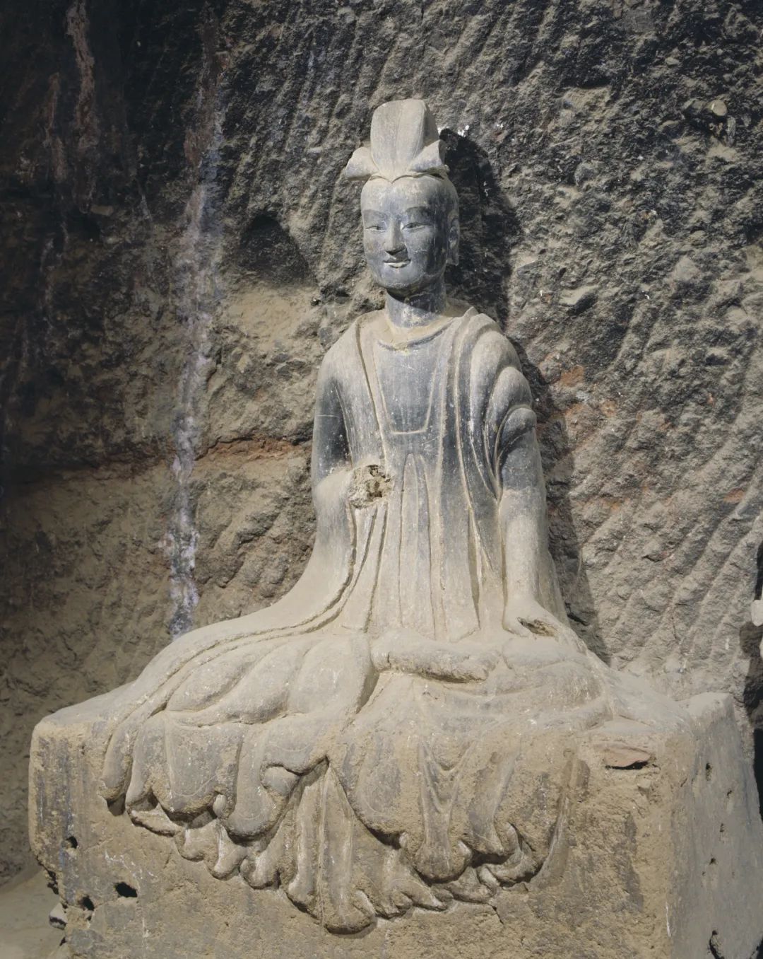 從題材上看,以單尊佛、菩薩、力士等為主,風格上更具有寫實性。造像面相橢圓飽滿,斜眉吊目,懸鼻小口,表情森嚴、凝重,服飾簡潔、質樸,寬博厚重,極富質感。其中佛低平螺髻,前置肉髻珠,身穿垂領袈裟。菩薩束發高髻或戴風帽,眉目慈祥,身材比例協調、準確。力士表情生動傳神,體形孔武雄健,充滿陽剛之氣,給人以強烈的力量和威武感;這段時間造像前衰后盛也與當時秦州所處環境有密切關系。