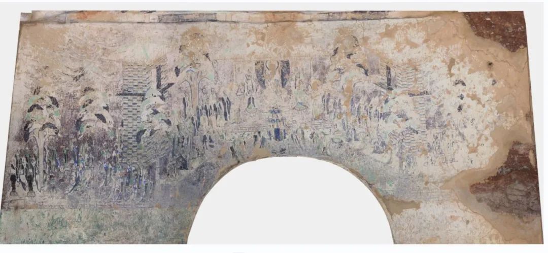 其中飛天裝飾技法的創新令人稱奇,如散花樓后室外側上方中間五組伎樂飛天的面部、手、足、樂器等均采取淺浮塑方式,而發髻、服飾、瓔珞、花卉、流云等則繪制而成,兩者之間的結合天衣無縫,構成了一幅幅栩栩如生、熱烈歡快的佛國圣境。