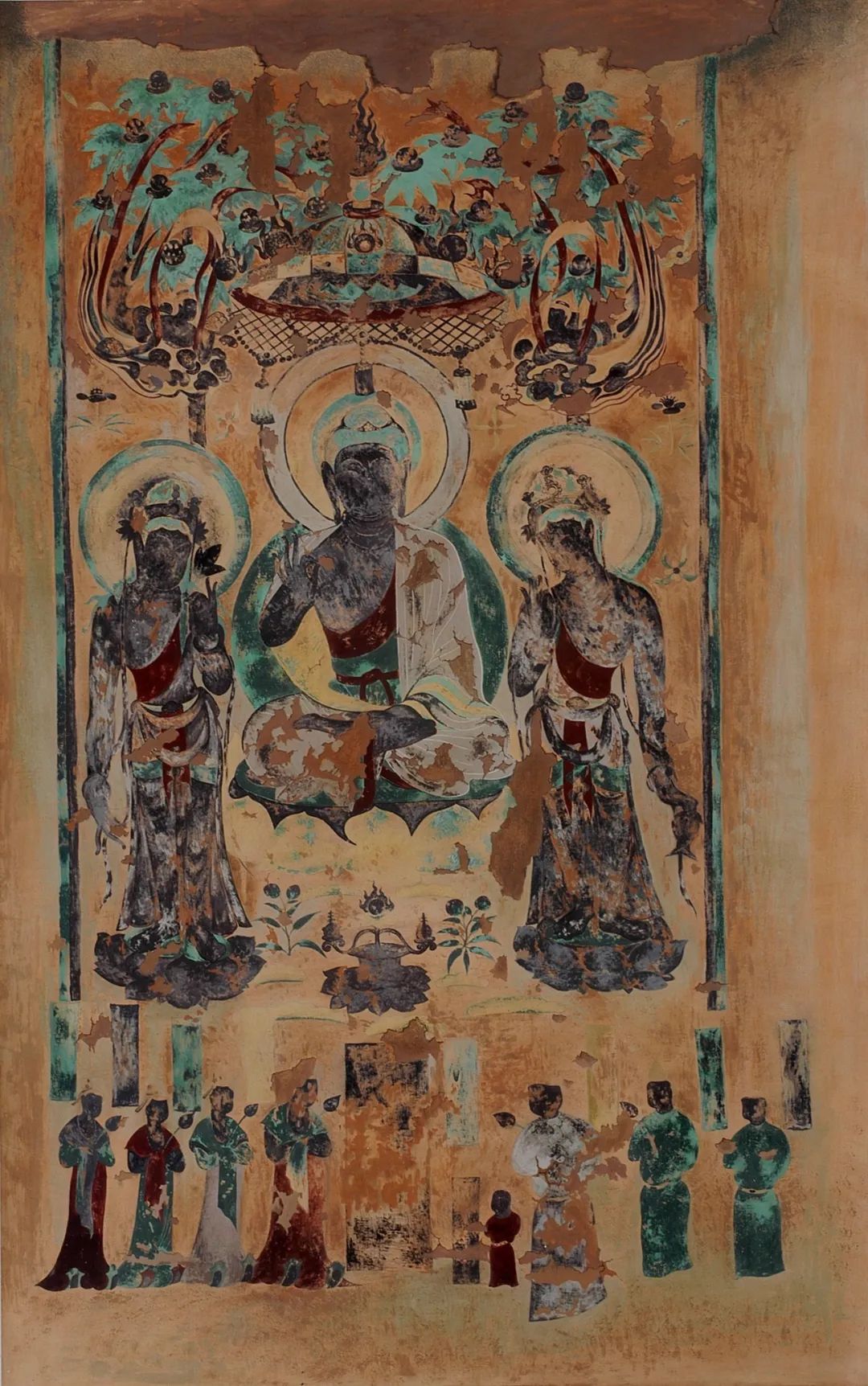 此外,第4窟后室大龕之間的墻壁上方保存有多幅唐代繪制的佛說法圖、供養菩薩、跪拜供養人形象。造像題材以一佛二弟子二菩薩組合為主,兼有傳統的三佛造像。
