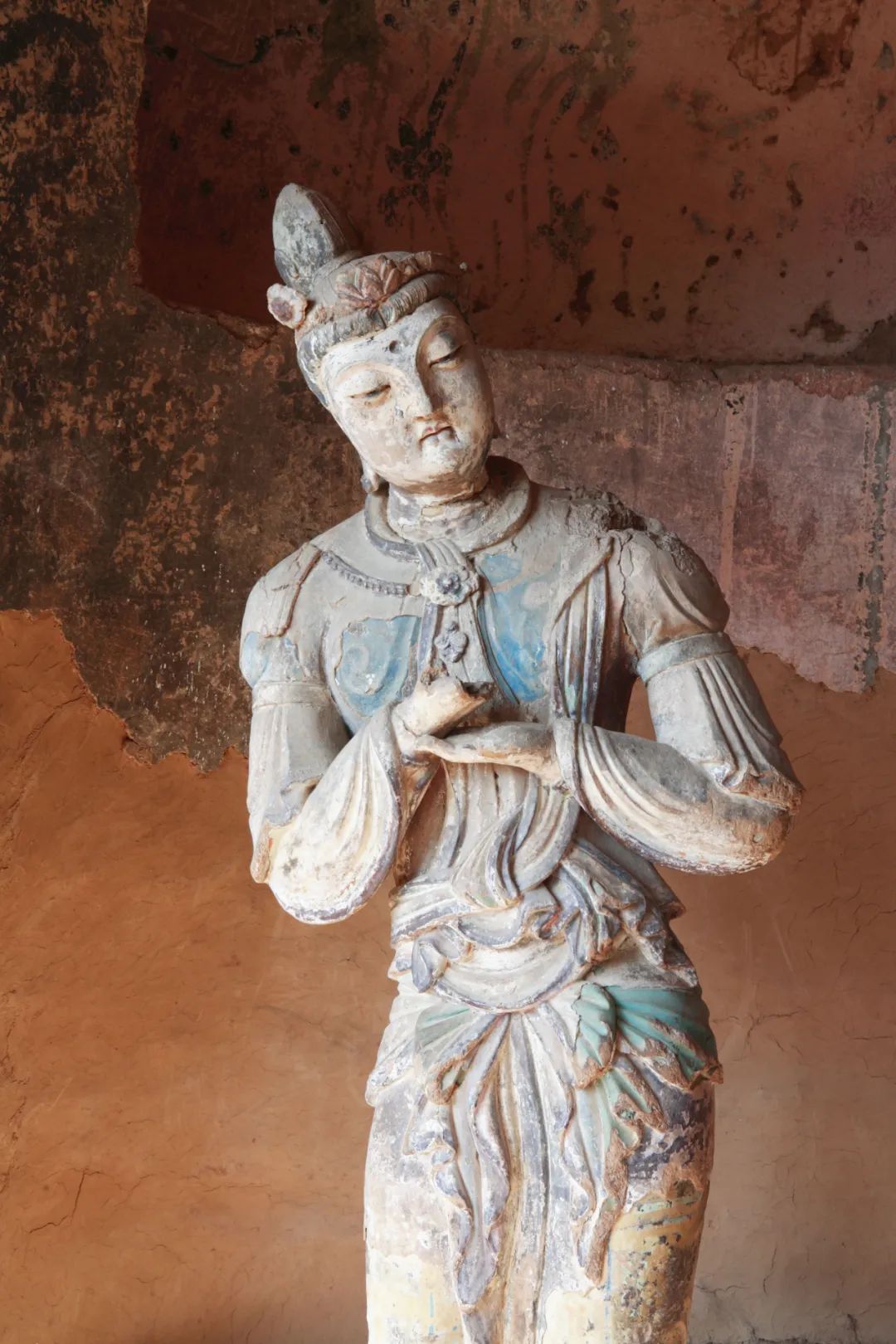 這一時期造像最杰出的代表是隋代開鑿的東崖大佛(第13窟),為石胎泥塑,正中主尊系阿彌陀佛,左、右分別為觀世音和大勢至菩薩,大佛高15.7米,氣勢宏偉,也是麥積山第一大佛。造像風格上,體態豐腴,神情雍容大度,服飾繁縟華貴,充分展現出隋唐王朝的盛世風貌。但由于地震、戰亂等自然和人為因素影響,盛唐以后的麥積山走向了衰敗。