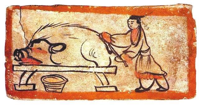 塢壁內(nèi)圈養(yǎng)的豬已膘肥體壯,被放置到長幾上,而被豐美水草喂大的小肥羊則被倒懸在架上,屠夫正磨刀霍霍。