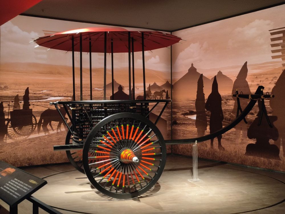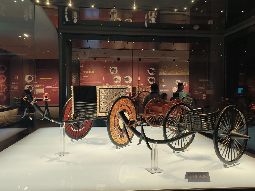 這些車(chē)輿依據(jù)張家川縣馬家塬遺址出土的車(chē)輛遺跡復(fù)制。馬家塬遺址是一處戰(zhàn)國(guó)晚期的西戎貴族墓地,共出土車(chē)輛遺跡69輛,隨葬品3600多件(套),2021年入選中國(guó)“百年百大考古發(fā)現(xiàn)”。