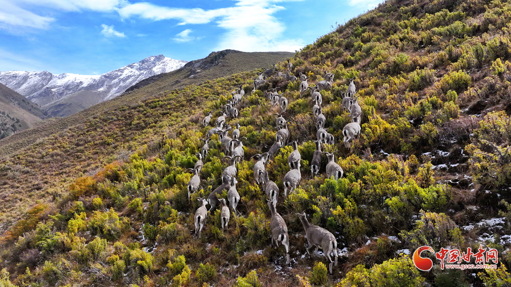 9月25日,位于甘肅省河西走廊的張掖市山丹馬場秋日初雪,遠處的祁連山上積雪與松柏交相輝映,巖羊在雪地里悠閑覓食,宛如一幅和諧的生態(tài)畫卷。