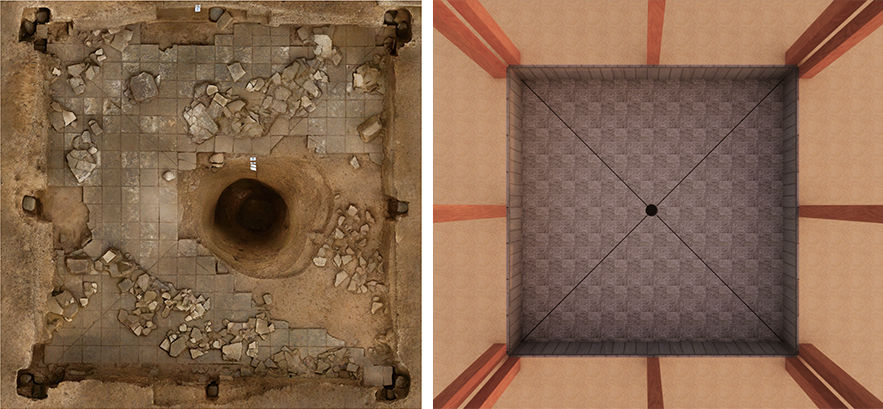 這是甘肅禮縣四角坪遺址中部夯土臺(tái)基中心的半地穴空間及甘肅考古工作者繪制的復(fù)原圖。