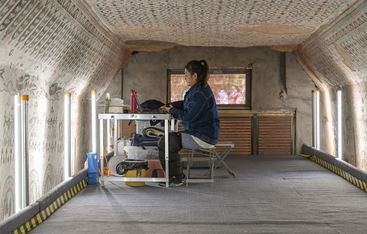 2023年8月3日,在敦煌莫高窟正在保護修繕的第55窟內,一位文保工作者對采集的數據進行整理。新華每日電訊記者 李賀 攝