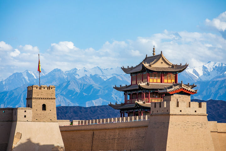 這是2023年7月19日拍攝的祁連雪山與嘉峪關關城。 新華社每日電訊記者 朗兵兵 攝